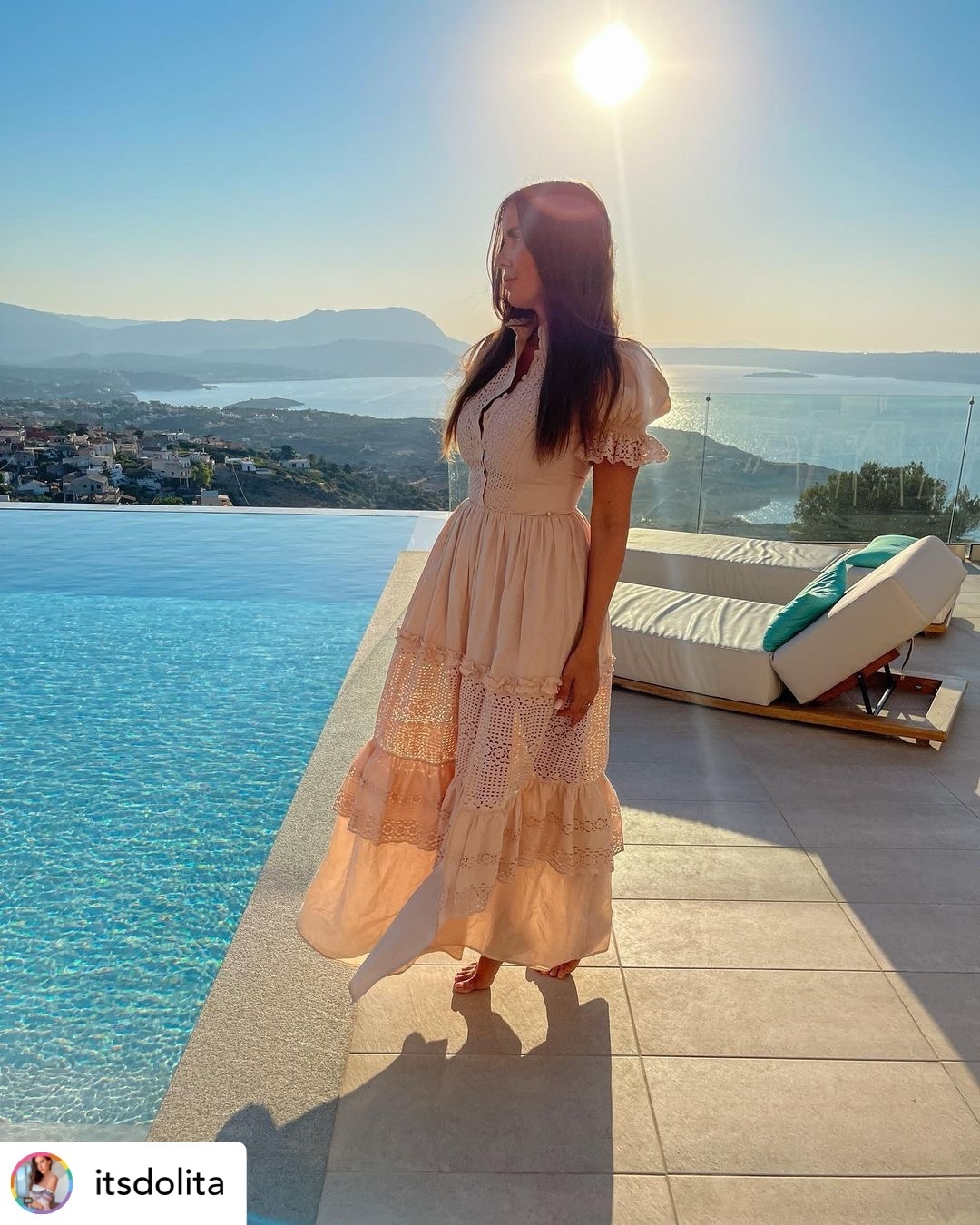 Delicate and subtle dress that emphasizes femininity :).Suggested by reviews I ordered size L although I wear M. Fits perfectly. Delicate beige will go nicely with the summer tan.I recommend!