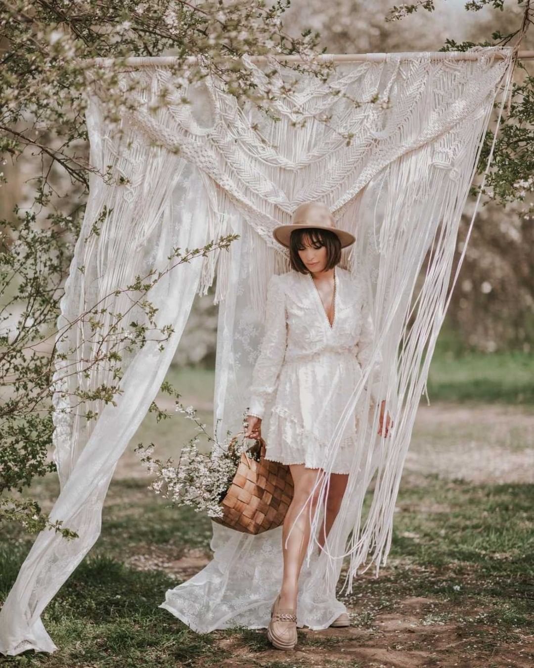 This gorgeous mini dress is a combination of the best of the wild west style and flower children. Dakota is part of our new collection and the dress we proudly present. Charming, girly and full of passion, it looks great both on the catwalk and in the scenery of an idyllic village. You will fall in love with her sensual neckline, long sleeves , finished with beautiful cuffs and a short hem that reveals your legs. Delicate and light as a feather ecru fabric is decorated with applications. The rich guipure ornamentation adds romanticism. This beautiful mini dress with character will look perfect with both cowboy boots and high heels for a more festive occasion. Great for a variety of occasions, it will add sparkle to you both on a date and at a night party, and even on a trip to the USA. And if you go to California, don't forget the flowers in your hair.