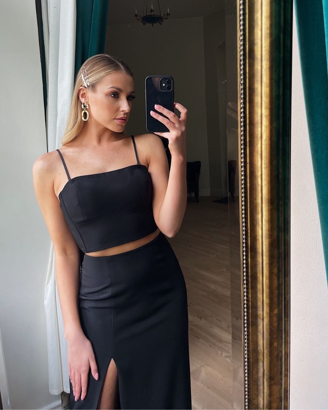 A two-piece composition in classic black in a simple shape. The maxi length of the skirt makes this set extremely elegant. The fabric is very luxurious, two-layered, also in the form of a lining. The corset is padded with whalebones and fastened at the back with tiny buttons. Another advantage is the possibility of unfastening thin, delicate shoulder straps. This set is sure to impress at various events. A tasteful jewellery accessory will complete this beautiful style. Decide for yourself whether timeless black or hot red colour of Donna set will match your character.