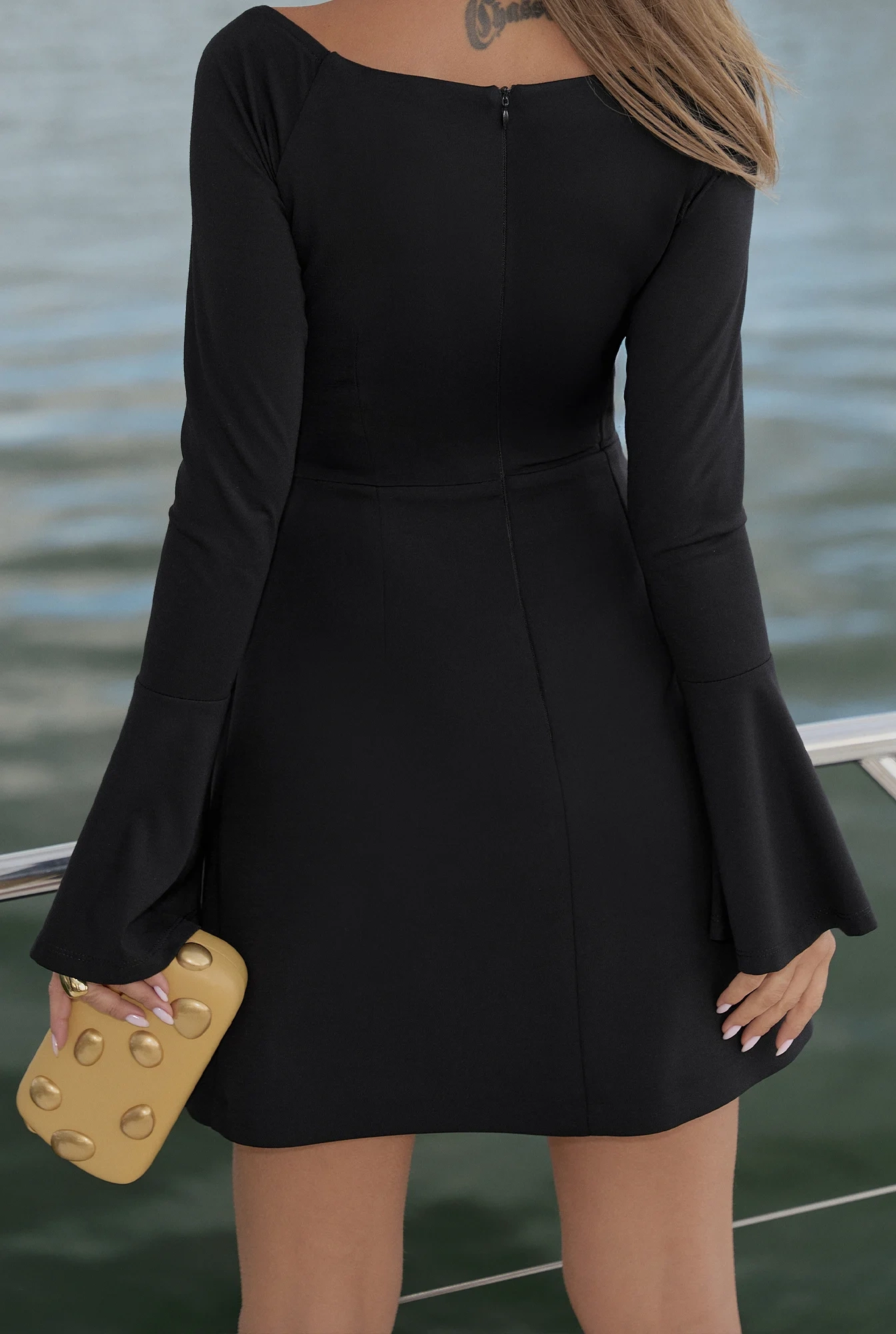 Emeline in classic black combines a modern cut with feminine details. The asymmetrical design highlights the unique character of the piece, while the decorative floral appliqué adds a refined touch – you can detach it to adapt the look to the occasion. Made from stretchy fabric with added viscose, it fits the silhouette perfectly and ensures comfort. The reinforced hem gives the dress an elegant shape and a slightly flared effect. Elastic inserts in the sleeves prevent the dress from slipping off the shoulders, and the zip fastening makes it easy to put on. This model is perfect for evening events as well as special occasions when you want to look both stylish and sensual.