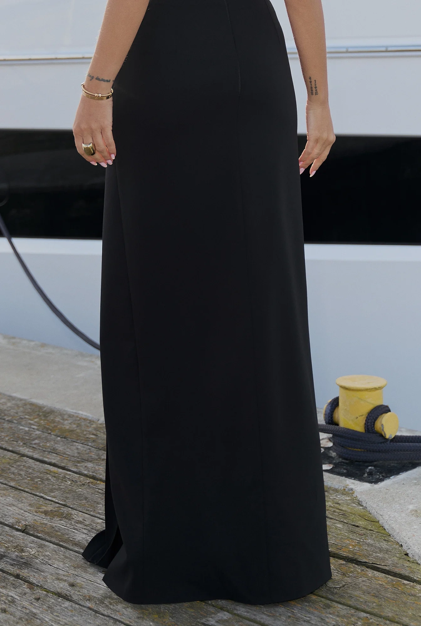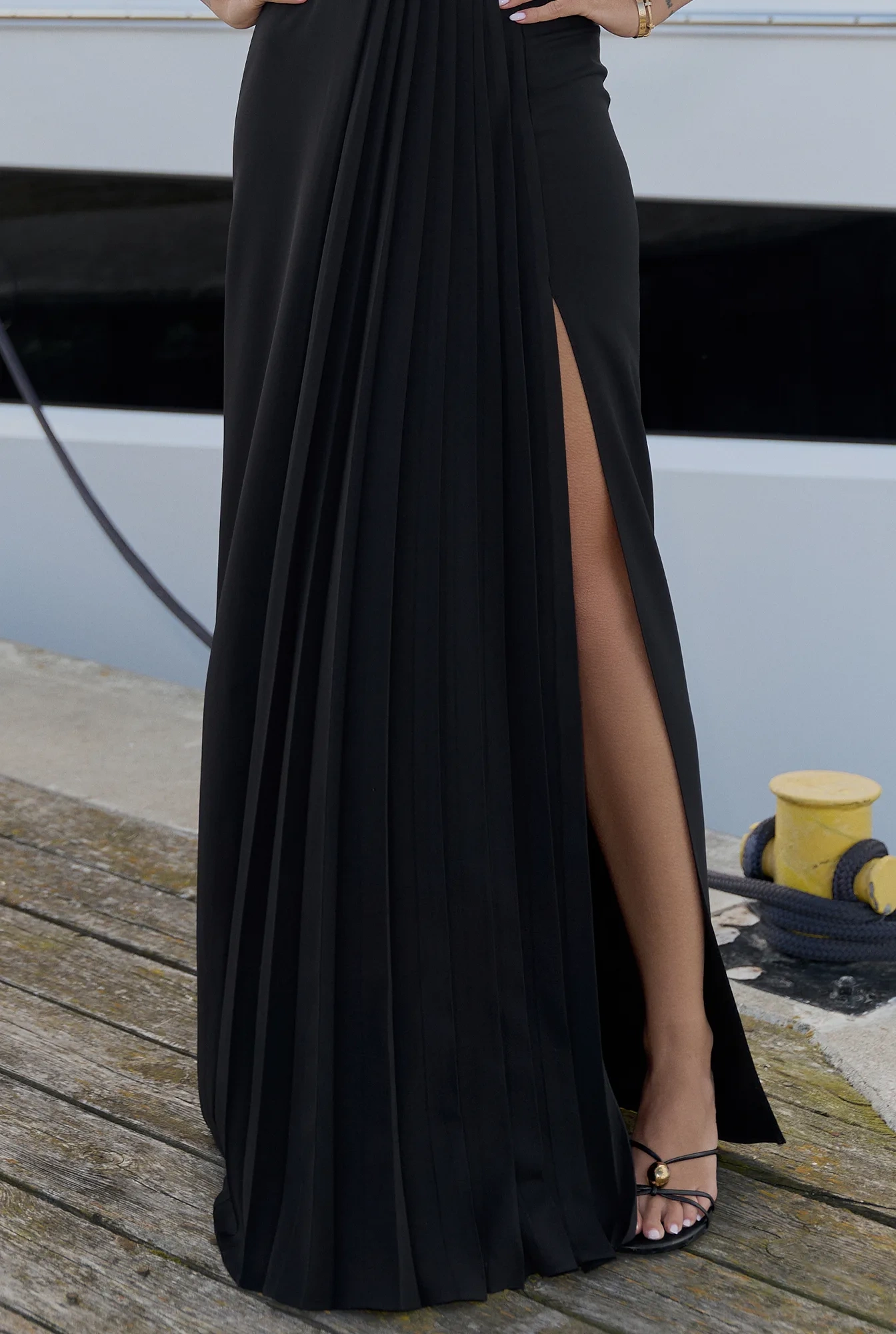 • Maxi dress with a boned corset and pleated front. The corset features an elastic band with hooks to support the bust. Design with lace-up back and zipper closure. The dress includes detachable straps. Interior finished with a viscose lining.