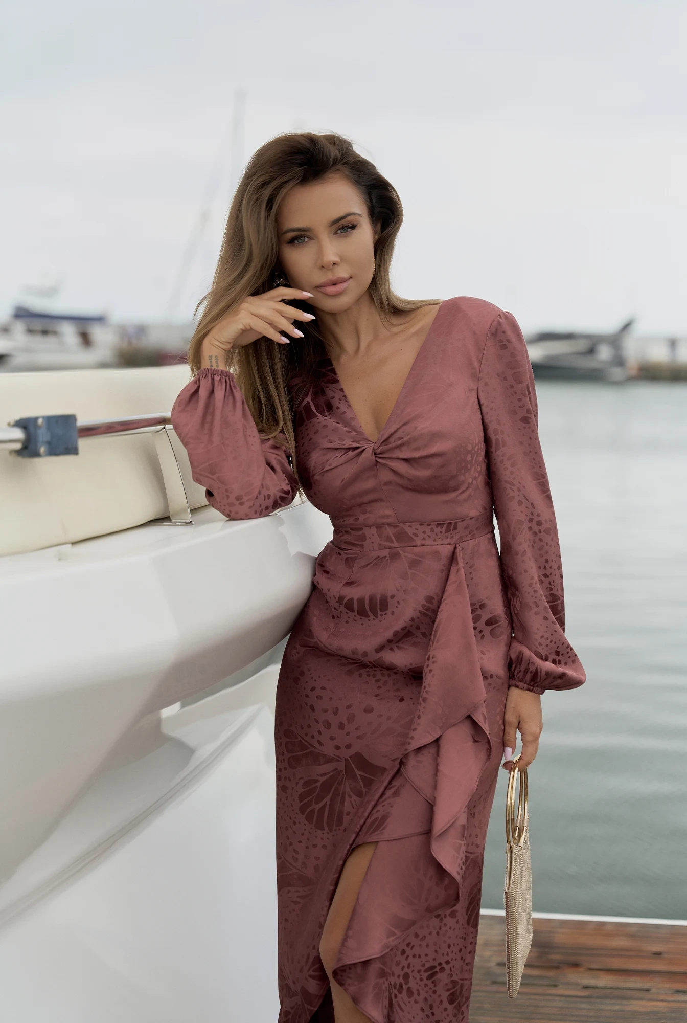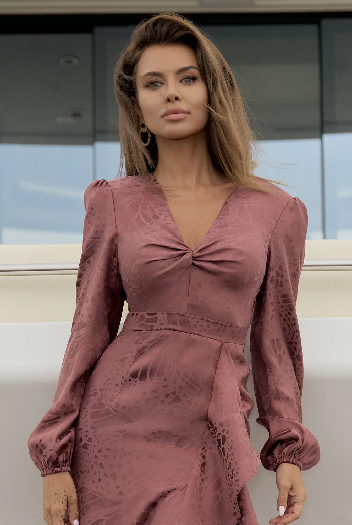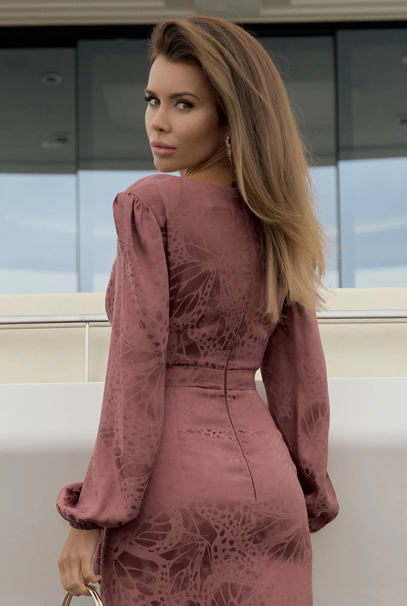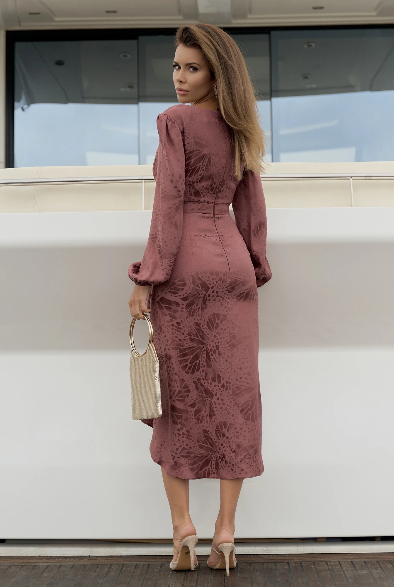 Midi dress made of soft, pleasant-to-touch viscose fabric, providing comfort and an elegant drape. The model is designed with a decorative slit at the front, adding lightness and subtly accentuating the legs. The shoulder construction with sewn-in pads enhances body proportions and defines the silhouette, while elasticated cuffs ensure comfort and a secure fit. A concealed back zip fastening makes it easy to wear. A timeless piece suitable for both everyday outfits and elegant occasions.