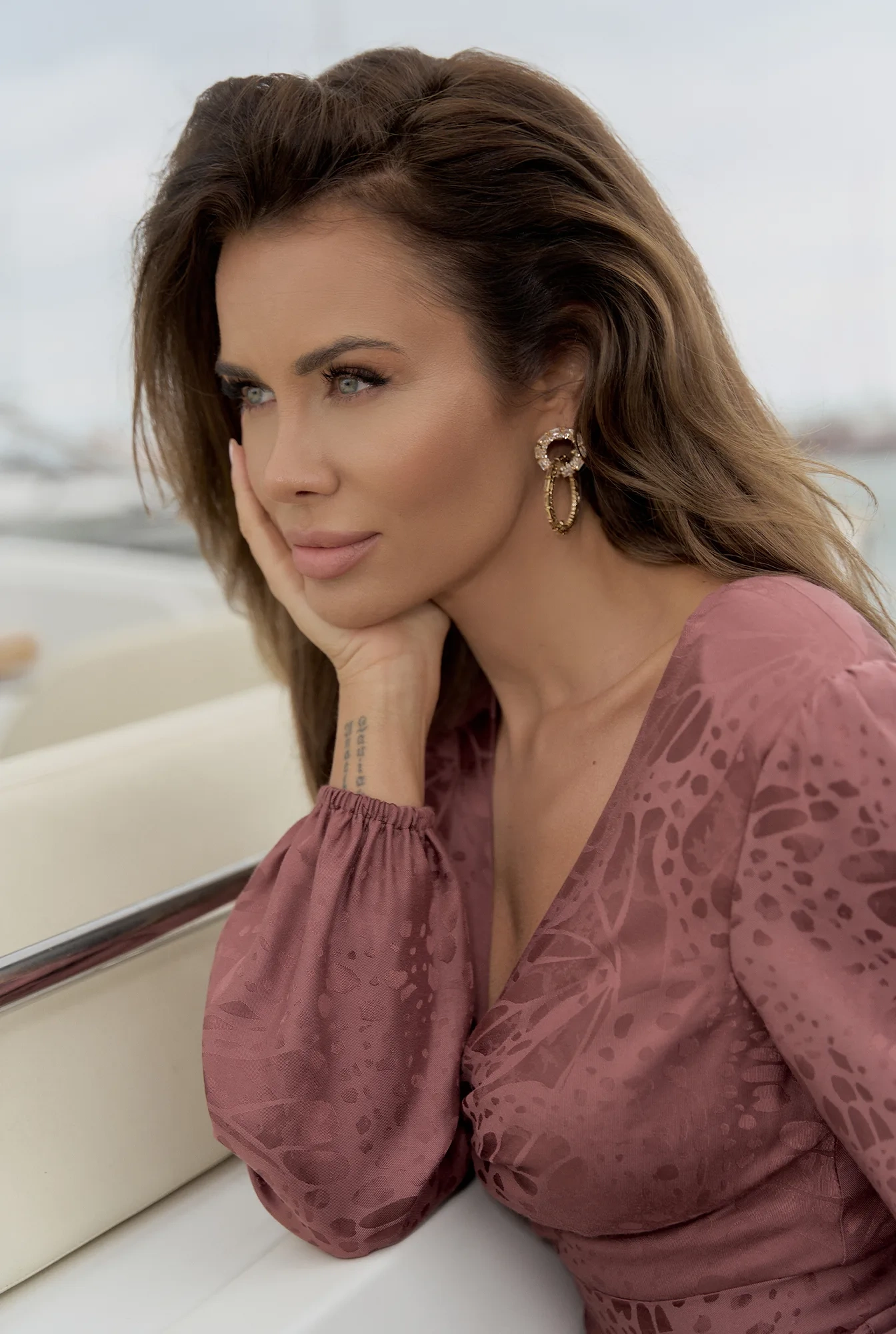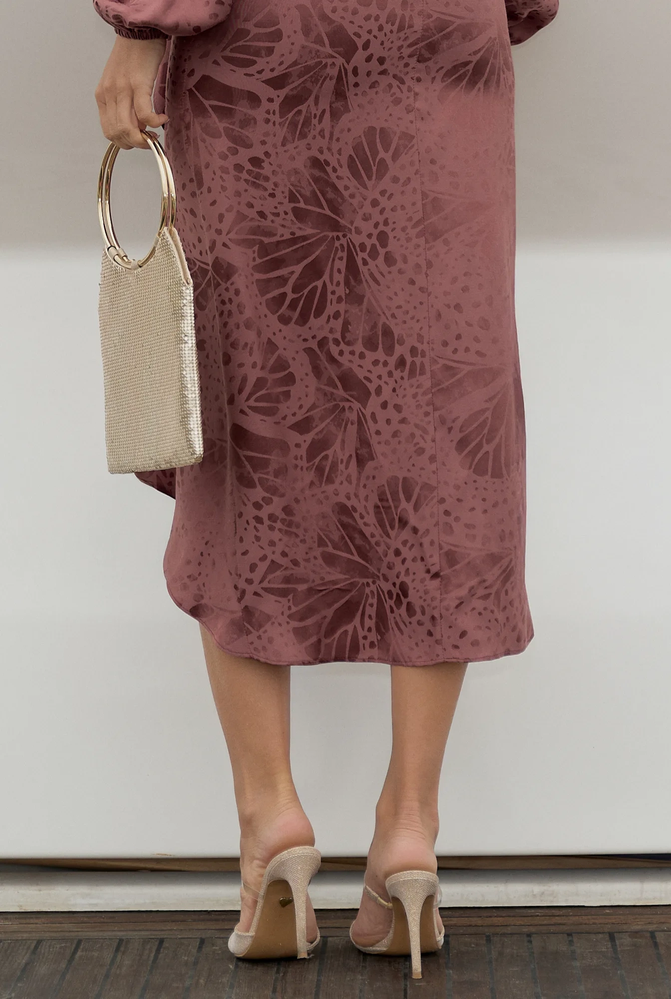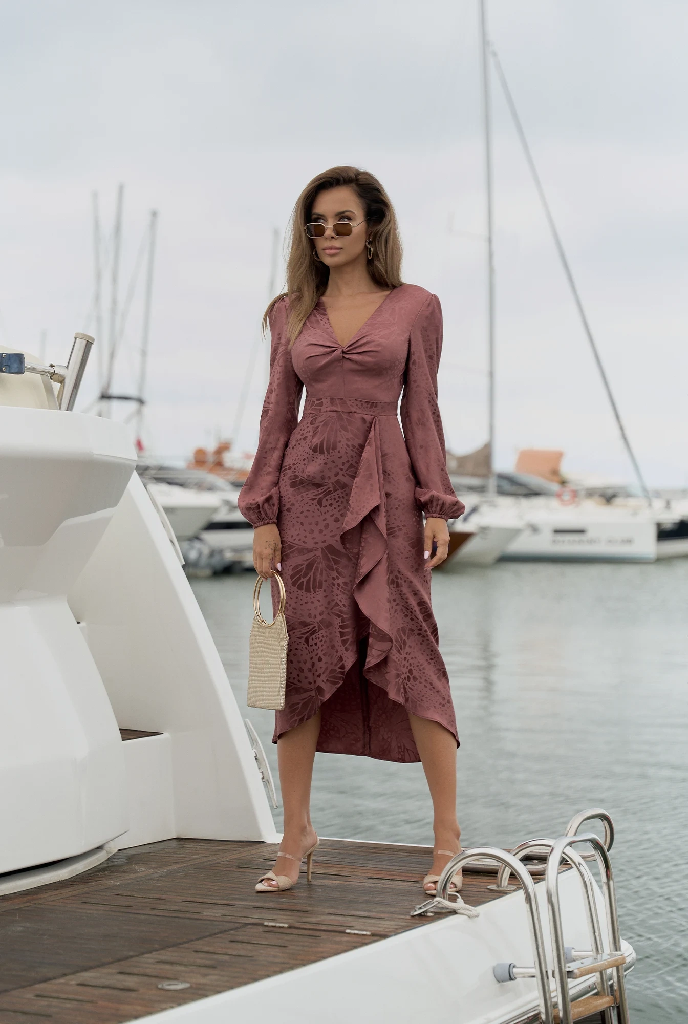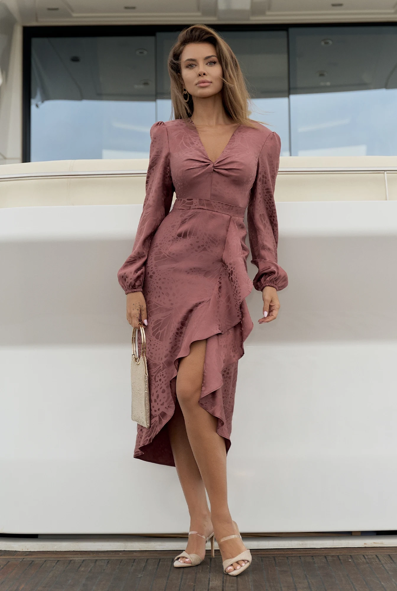 Midi dress made of soft, pleasant-to-touch viscose fabric, providing comfort and an elegant drape. The model is designed with a decorative slit at the front, adding lightness and subtly accentuating the legs. The shoulder construction with sewn-in pads enhances body proportions and defines the silhouette, while elasticated cuffs ensure comfort and a secure fit. A concealed back zip fastening makes it easy to wear. A timeless piece suitable for both everyday outfits and elegant occasions.