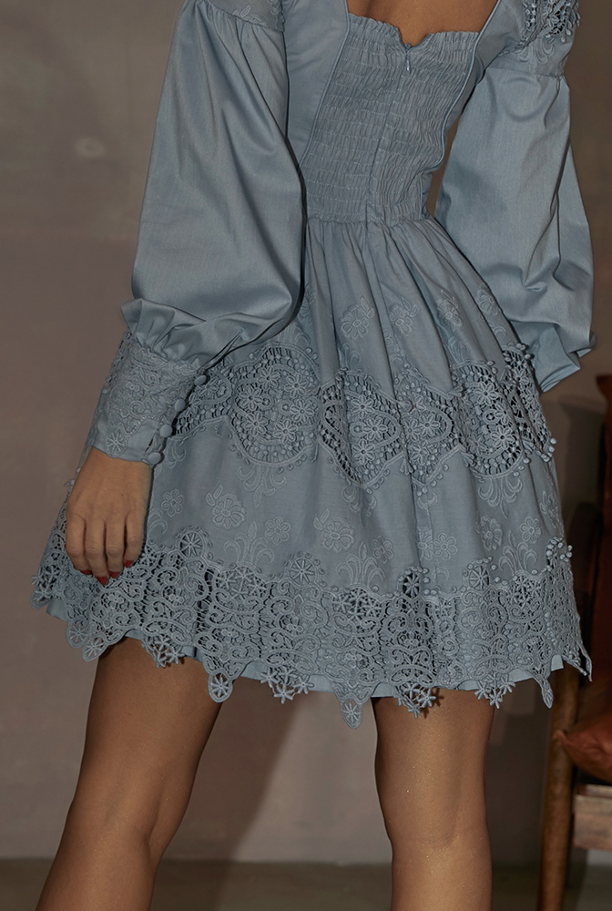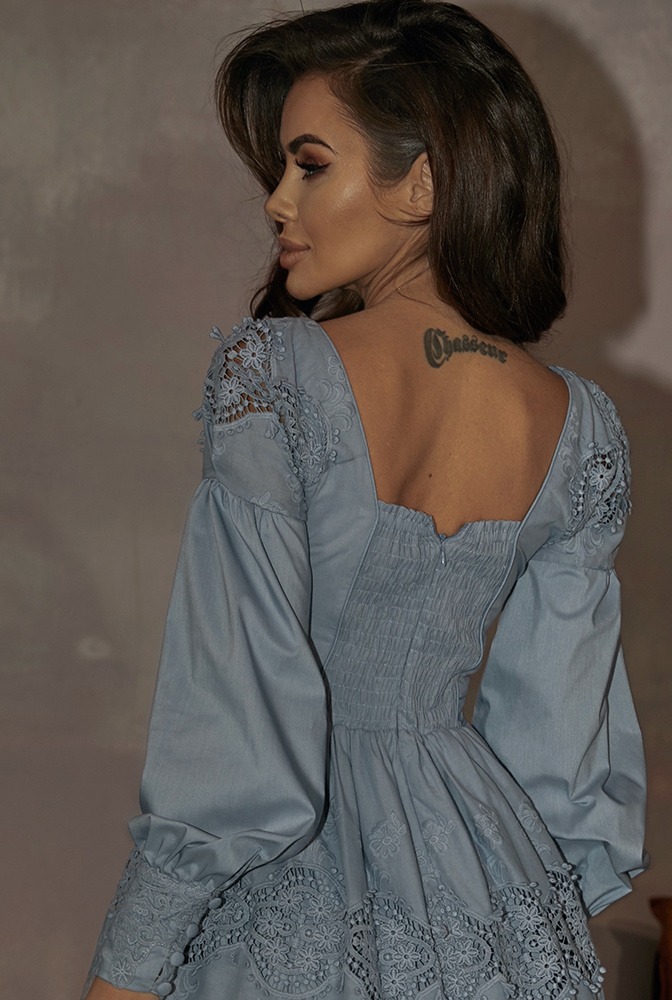 Beautiful finish of the dress, the lace is impressive. Thanks to the crease at the back, the dress fits perfectly to the figure;) color I would describe as blue-gray;)