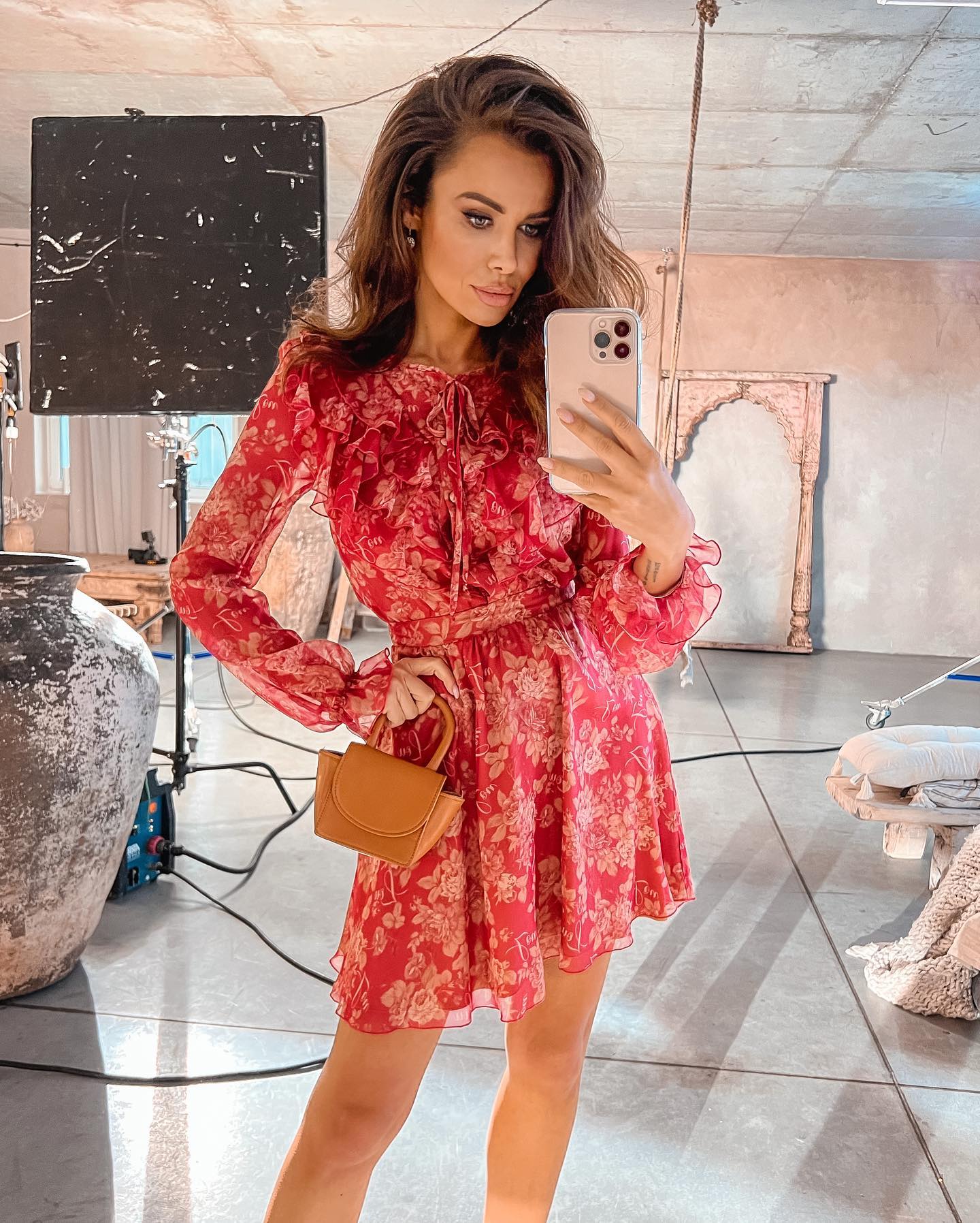 This cocktail dress will surely surprise your figure. The color of red with a floral print and logging is complemented by a composition of frills. Long sleeves and a high neckline make this outfit interesting in form. The length of the mini Judith dresses and the delicate fabric allow for the comfort of wearing. Selected, delicate accessories will emphasize the charm of this charming dress.