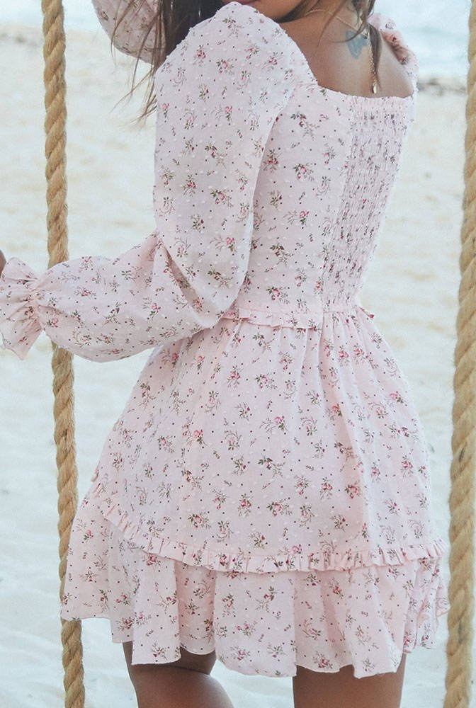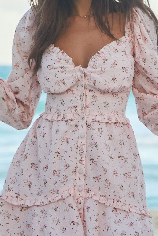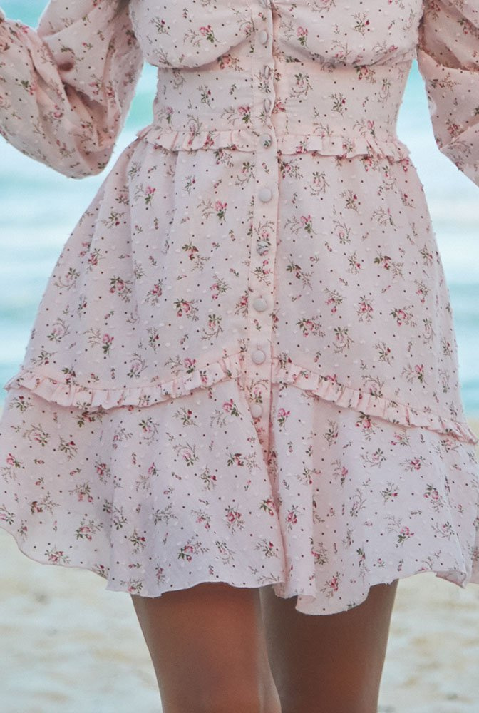 • Dress made of a delicate fabric in a shade of pastel pink with a tinyl floral print. Fabric with tiny dots. Dress with decorative buttons at the front and an elastic band on the back.