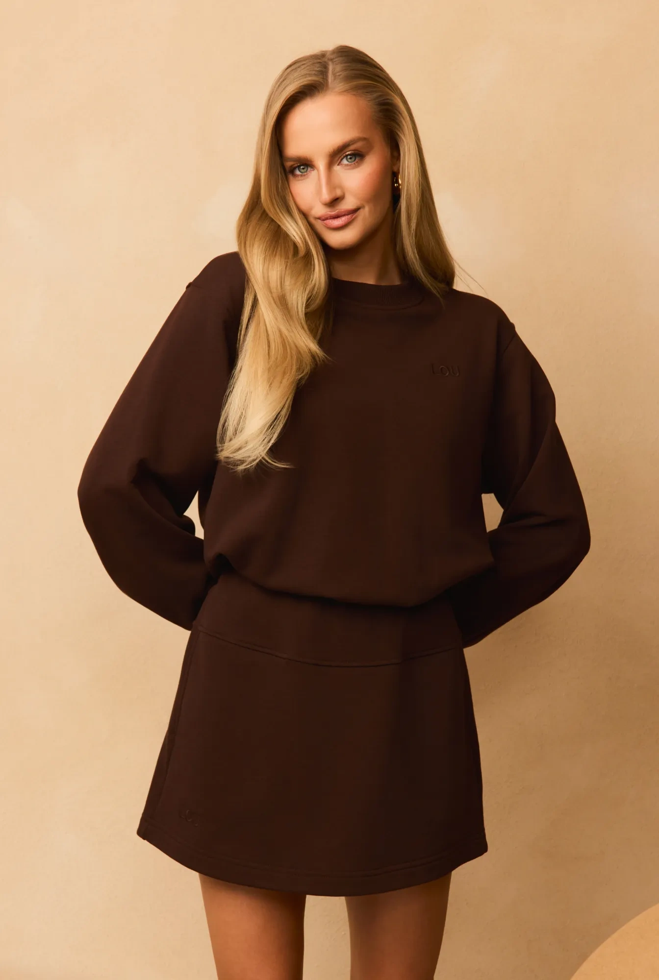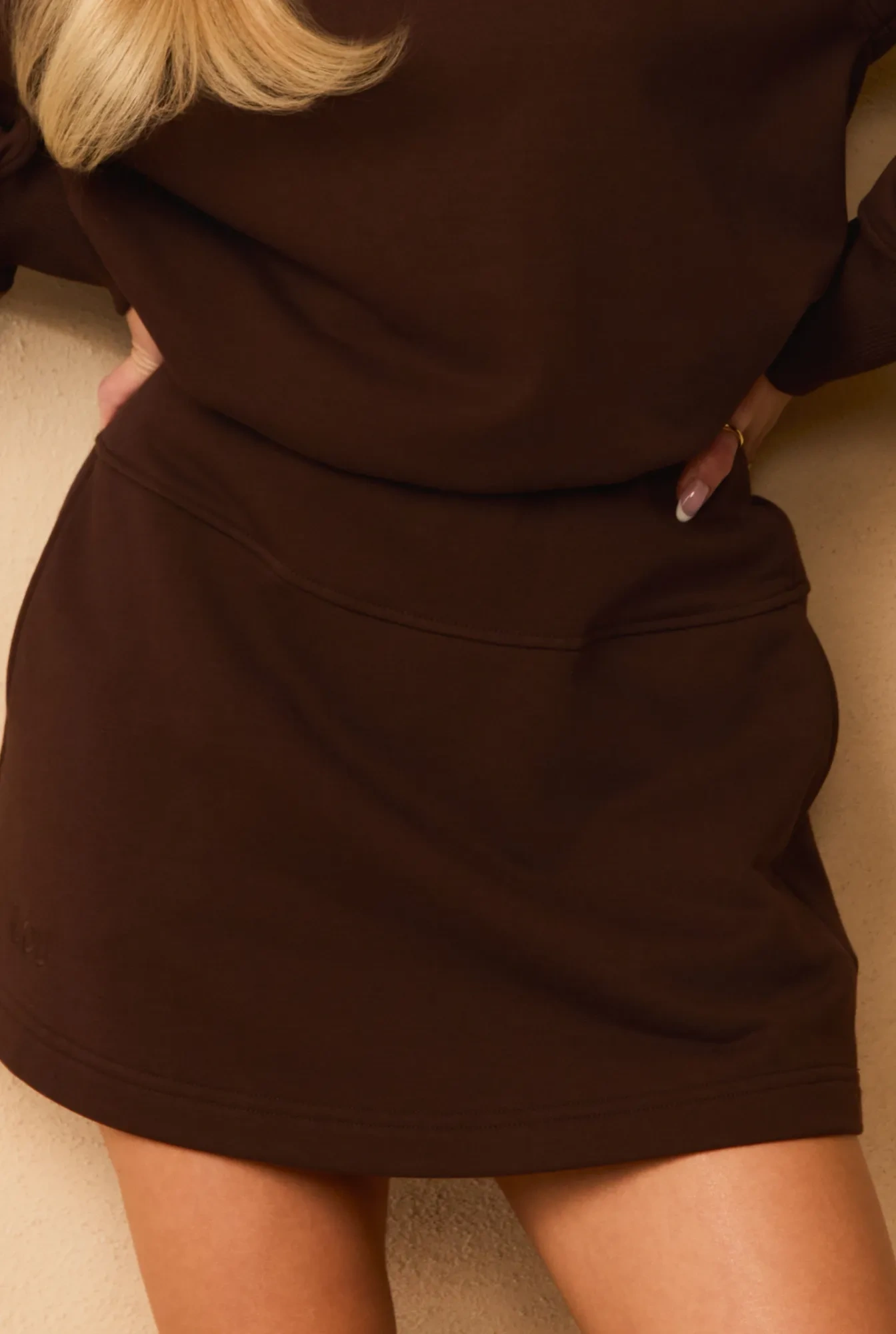 Keyti is a stylish and functional tracksuit set in a chocolate brown shade, made of cotton. The set consists of a comfortable sweatshirt and a skirt with practical hidden shorts underneath. The bottom of the sweatshirt and the skirt's waistband are finished with an elastic band, ensuring a perfect fit and all-day comfort. It is an excellent choice for women who value sporty elegance and freedom of movement in their everyday outfits.