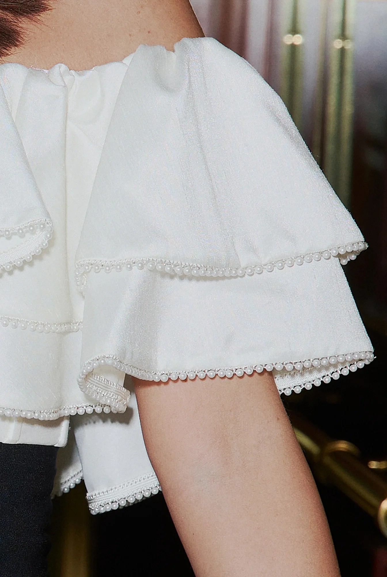 • Corset top with a Spanish neckline in ecru. Decorated with a ruffle finished with a pearl trim. The top features a lining and adjustable tie at the back.