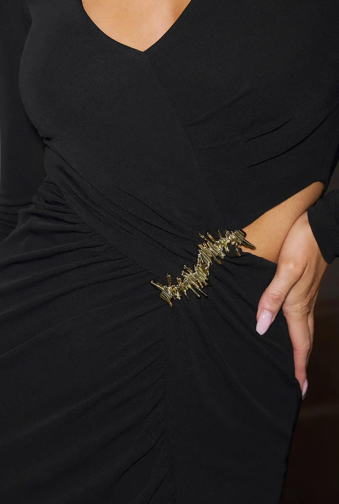 • Maxi dress with a detachable brooch. Made from stretch rayon fabric, with decorative ruching and padded shoulders. Fastens with a back zipper.