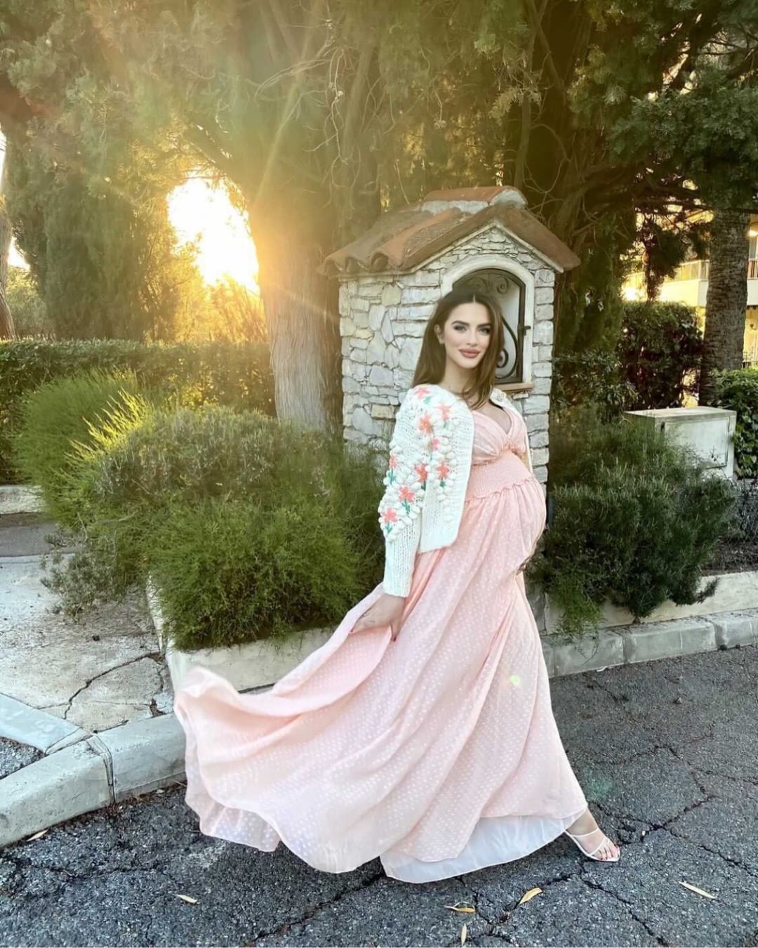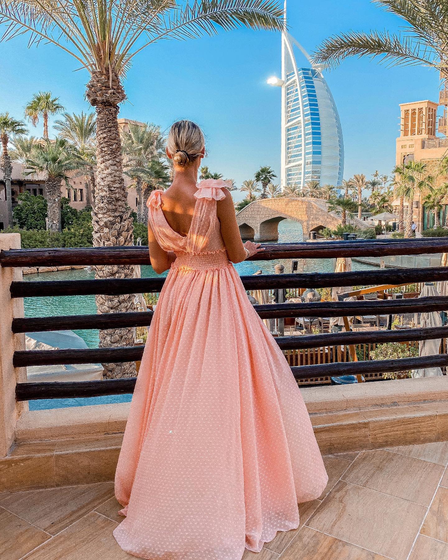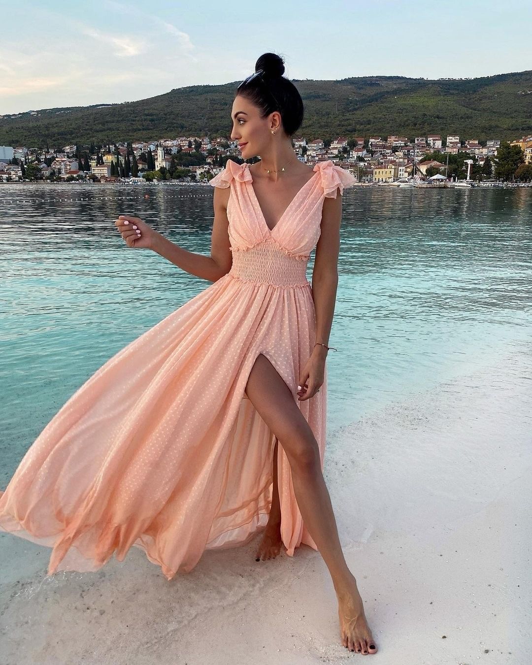 • Maxi-length dress made of airy peach-colored material. Decorative fabric with dots. The dress has a sewn-in lining. The elastic at the waist adapts to the figure and emphasizes it.