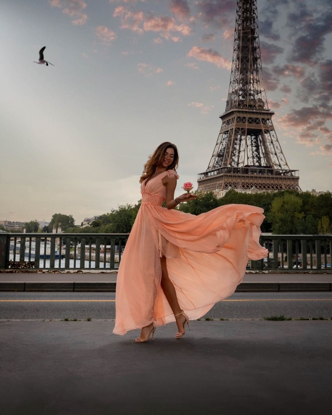 Charming, airy dress in maxi length. The sweet peach colour will beautifully contrast with a subtly tanned complexion. The delicate fabric slenderises the silhouette, while the dotted pattern gives this original creation girlish charm. The dress is embellished with a mysterious, long slit on the leg, elastication under the bust and wavy ruffles on the shoulders. Summer outdoor parties, magical meetings for two will be a great opportunity to present yourself in this unique fashion piece. Shiny summer shoes and sophisticated jewellery will create an unforgettable atmosphere with Nanotti dress