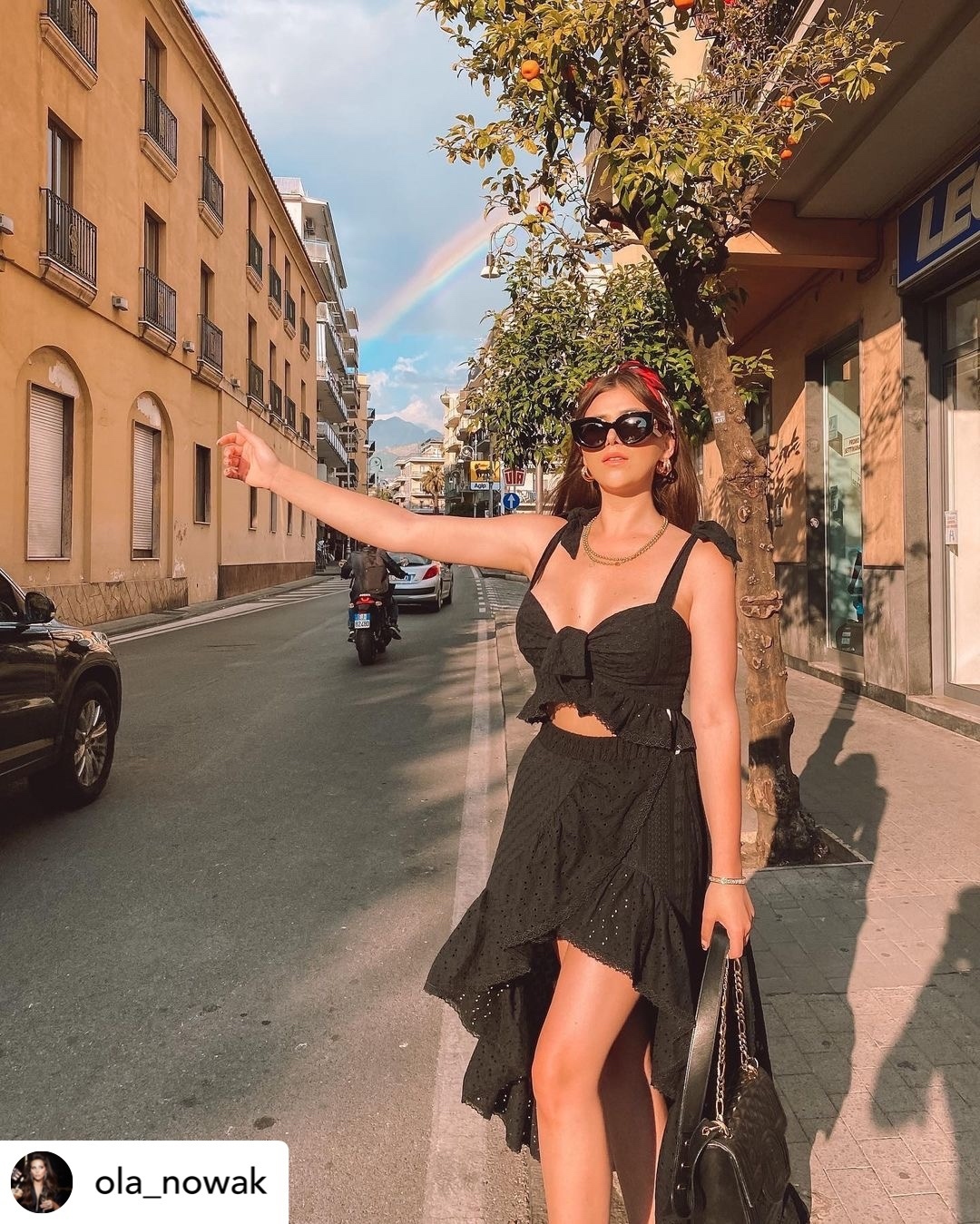 A ravishing set of two boho elements. A short top with straps with a sophisticated binding plus a long asymmetrical skirt with flounces. Deep black embroidery perfectly creates this Peggie model. Exposed flirtatious legs and arms add a pinch of fantasy to any holiday trip. Put on this set with a hat of our accessories and set off in search of memories full of enthusiasm. Among the cool novelties, we took a look at boho dresses .