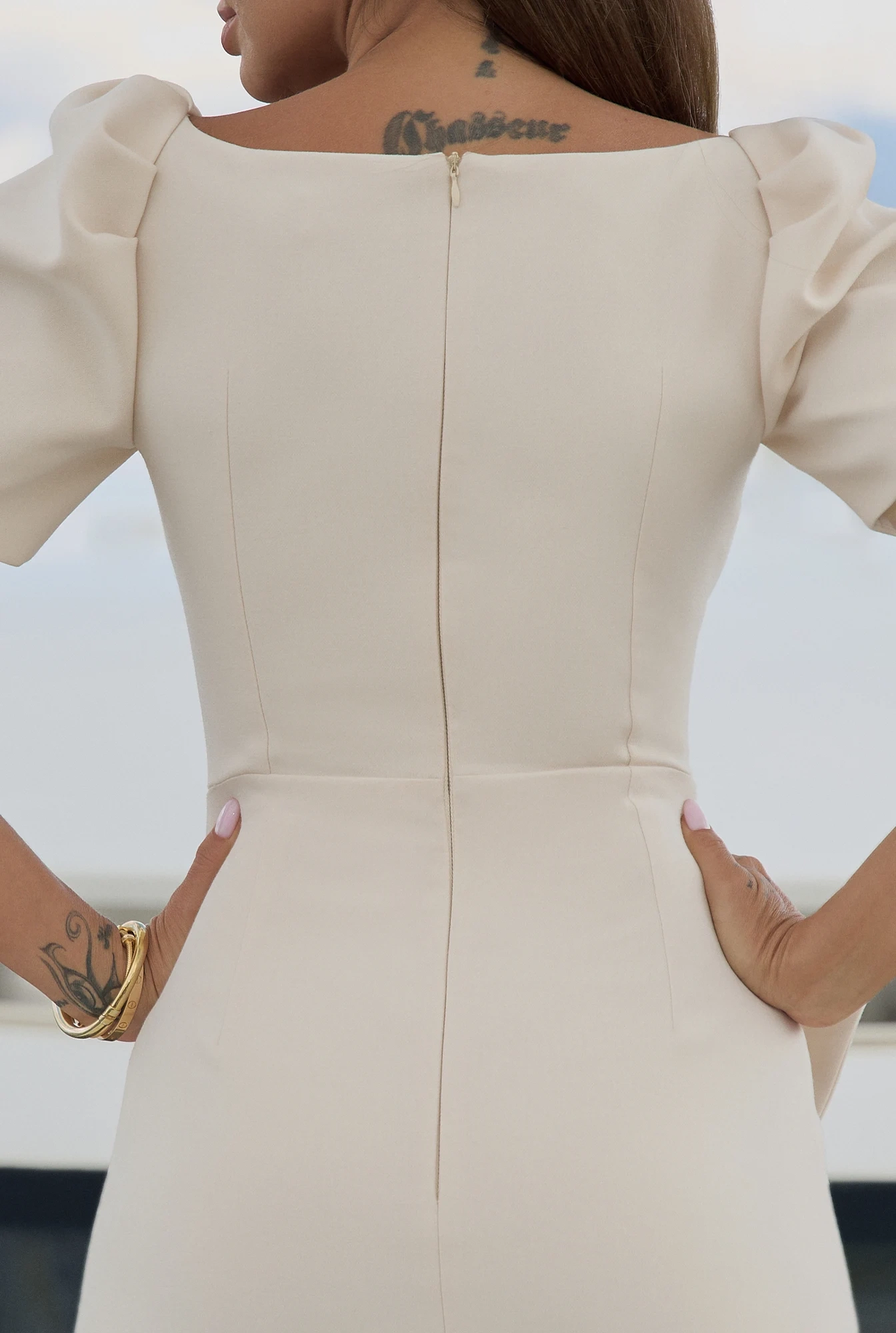 Phillis – ecru mini dress with decorative gold buckle