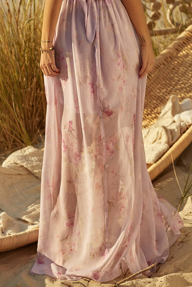 • A maxi dress made of airy, logged "Lou Girls" fabric in powder purple color. Delicately puffed sleeves and a V-neckline. At the back it is fastened with a zipper.